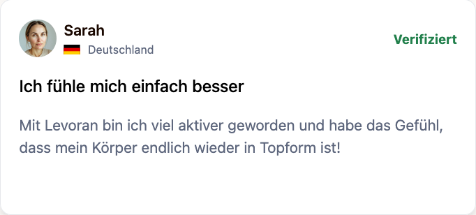 Wissenschaftliche Studien haben gezeigt, dass Himbeerketone und andere Inhaltsstoffe in Levoran sehr wirksam bei der Aufrechterhaltung eines gesunden Gewichtsgleichgewichts sind. Wir können daher davon ausgehen, dass es sich hierbei um eine wirkungsvolle Kombination handelt, die gut geeignet ist, persönliche Ziele zu erreichen.